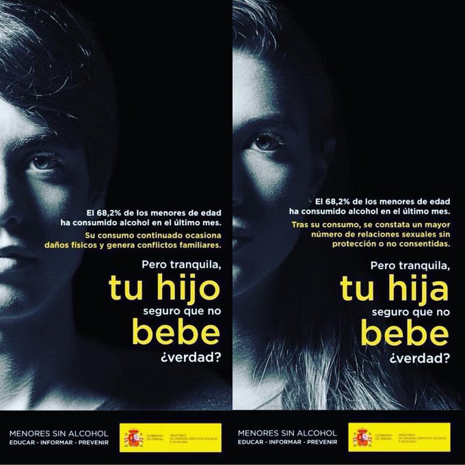 La campaña incluye dos imágenes. En una aparece el rostro de una joven adolescente, “el 62% de los menores de edad ha consumido alcohol en el último mes. Tras su consumo, se constata un mayor número de relaciones sexuales sin protección o no consentidas. Pero tranquila, tú hija no bebe, ¿verdad?”.