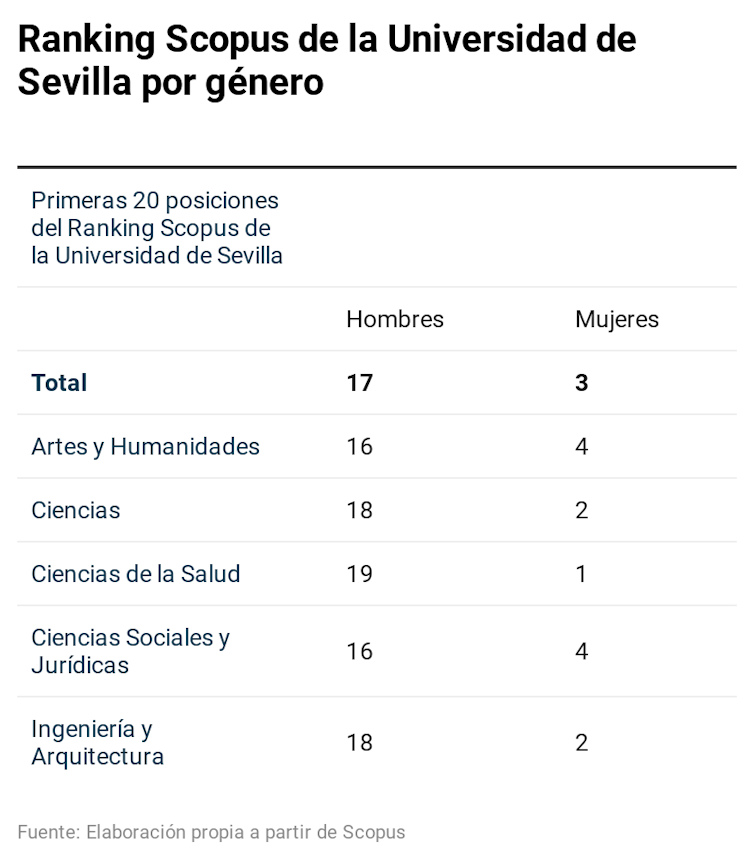 Nuestra propia universidad, la de Sevilla, también tiene que avanzar en una mejora de la representación de las científicas. Tal y como evidencia esta tabla, las mujeres son minoría en todas las áreas. Suenan poco comunes nombres reconocidos como los de Montserrat Vilà Planella, Carmen Ortiz Mellet, Catalina Alarcón de la Lastra Romero y Amparo Mármol Conde. Es necesario darles visibilidad para contrarrestar la desigualdad latente en la ciencia.